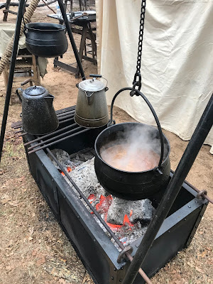 The rig utilizes a large canvas "fly" that covers the food preparation area and provides room for some seating. It is a cool and rainy year, so additional "drops" which create a wall along the north side were hung to keep the rain out. Even the stakes for the fly are hand cut Bois d'arc reinforced with rawhide for extra strength. The woven bottom chairs and wagon-slat tables are also authentic.